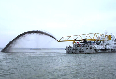 利用挖泥船將航道內的泥土挖出后,使用管線將挖出的泥土排放到需要進行回填的港口或碼頭上,通過泥土回填的方式來使港口和碼頭填筑到需要建設的高度,這便是吹填工程。